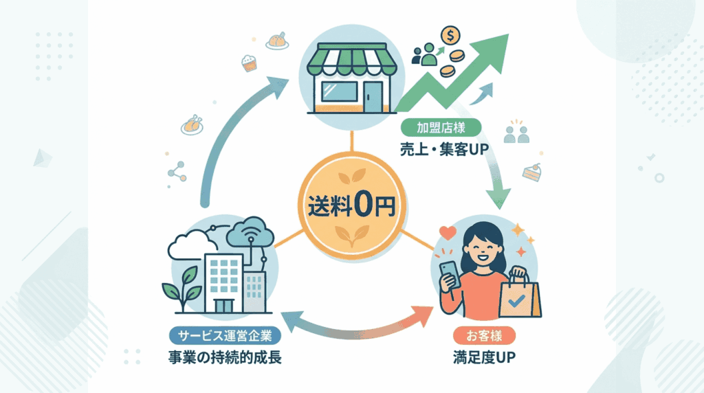 また、運営母体の高度なAI技術により配達ルートを最適化し、これまでユーザー負担となっていた配送手数料やサービス料を「完全無料」にすることに成功しました。これにより、貴店は無理な価格上乗せをすることなく、適正価格で勝負することが可能です。小規模な個人店様から大手チェーン店様まで、規模を問わず安心して導入いただける、持続可能なデリバリーモデルです。